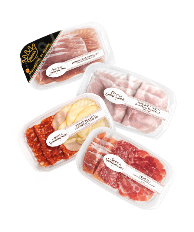 Storie di Gastronomia propone salumi e formaggi pronti da servire, presentati in vassoi che riprendono l’idea del tagliere tradizionale in chiave pratica e contemporanea.