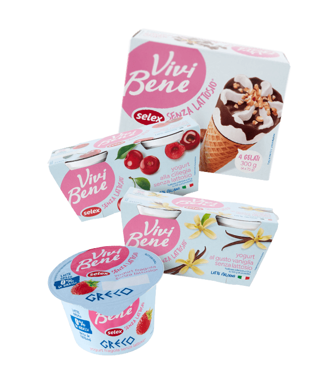Vivi Bene Selex Senza Lattosio è la linea dedicata a chi, per esigenze nutrizionali, deve rinunciare al lattosio. Grazie a questa vasta gamma di prodotti avrai a disposizione non solo latte, latticini e ottimi formaggi da poter gustare in tutta serenità, ma anche golosi yogurt in diversi gusti e formati e ottimi gelati per le tue colazioni e merende senza pensieri.
